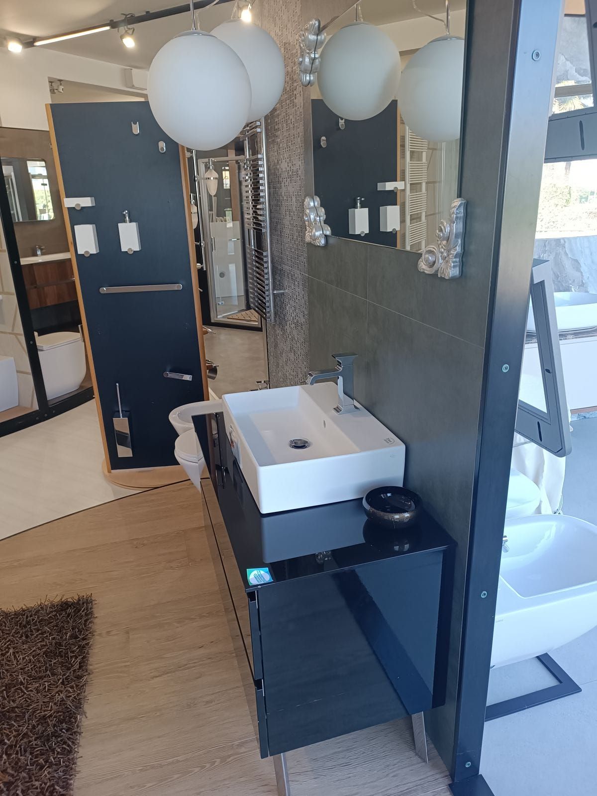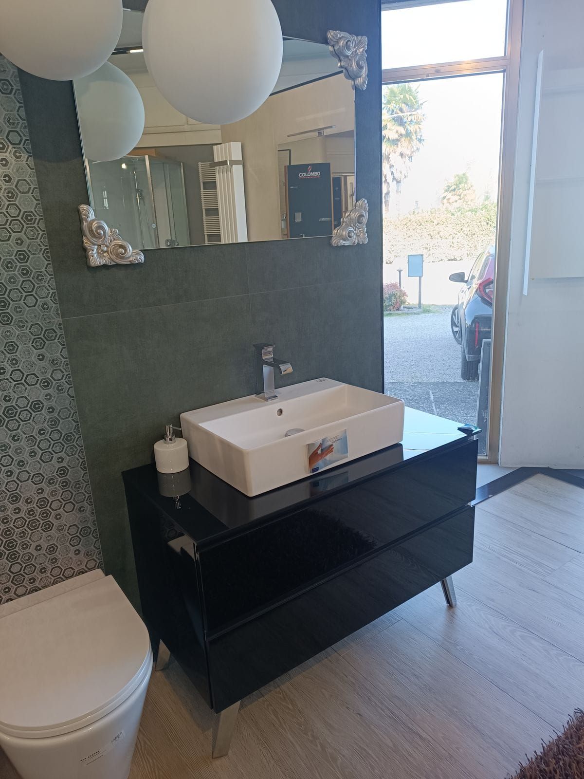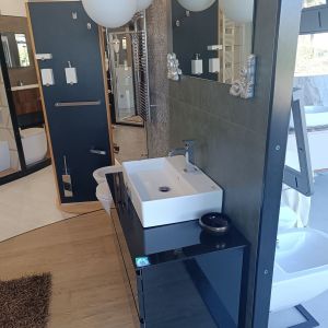 Finitura nero lucido comprensiva di top in cristallo specchio e lavabo in ceramica. Nell’offerta non è compresa la rubinetteria